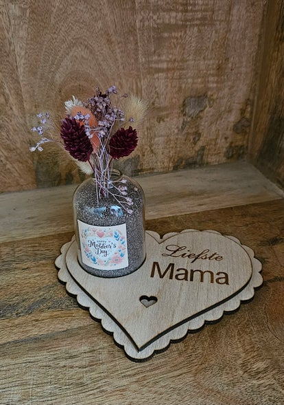 Houten hartje met vaasje gevuld met decoratiezand en droogbloempjes. Het vaasje kan ook gepersonaliseerd (bedrukt) worden met bijvoorbeeld "Mama", "Moeke",...(+1,00EUR)