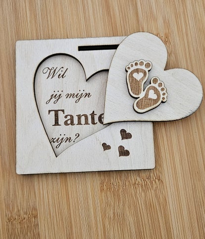 Houten kaart met aankondiging of vraag "jij wordt tante"