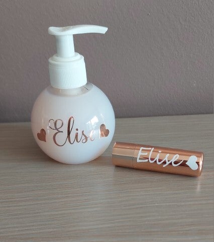 Een lippenbalsem gecombineerd met een met handzeep gevuld zeeppompje, beiden gepersonaliseerd met naam.