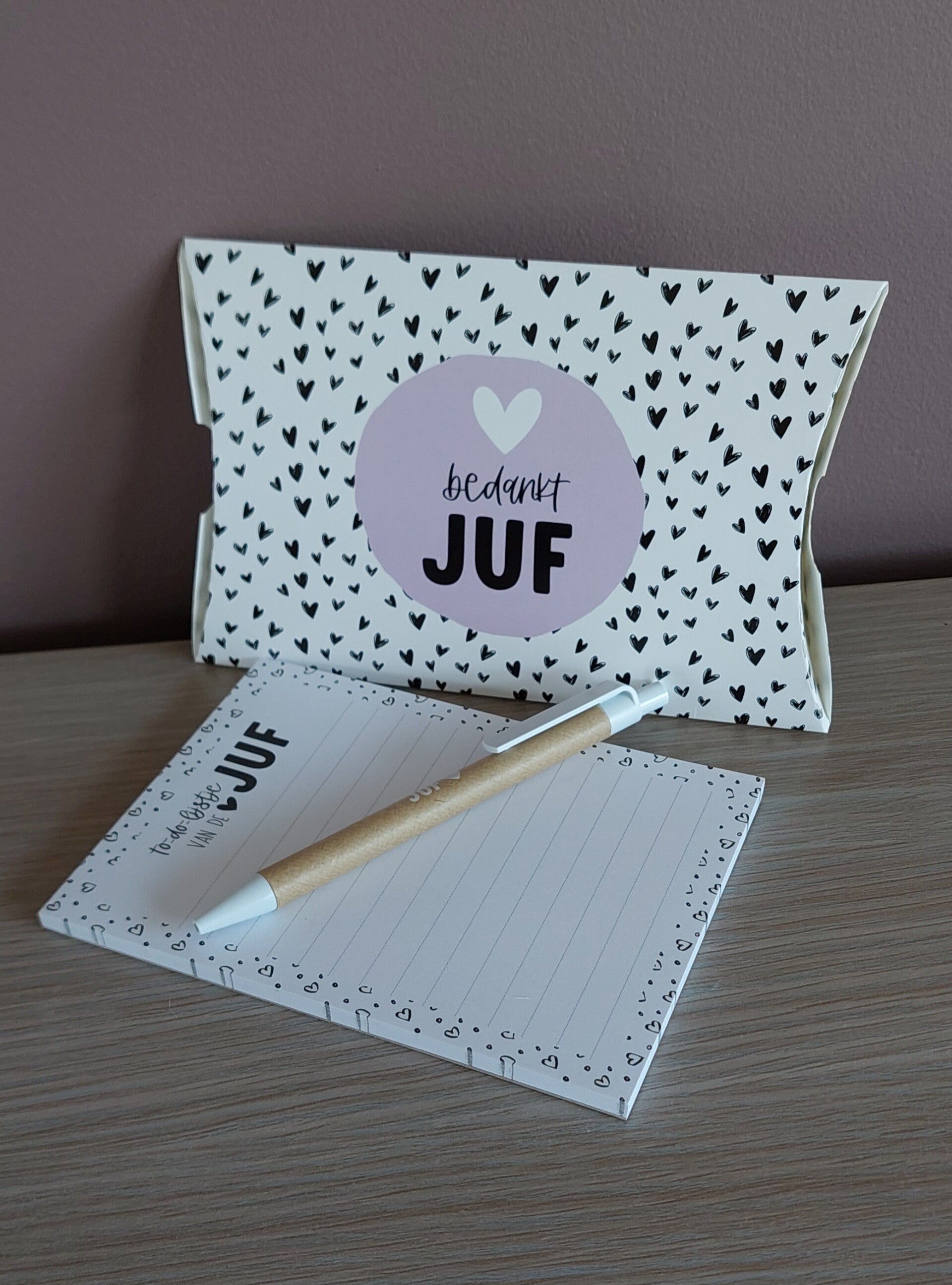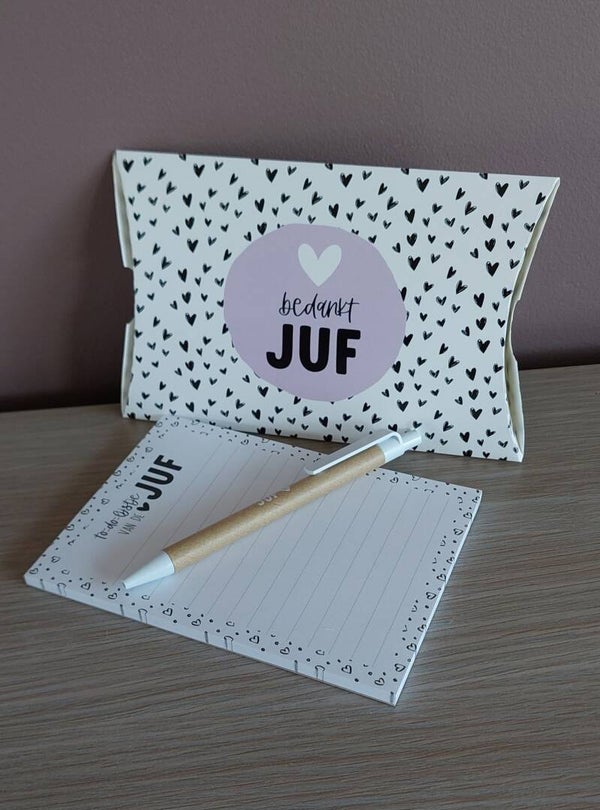 dit leuke setje bestaat uit een bedrukte pen en een boekje voor juf of meester, verpakt in een gondeldoosje