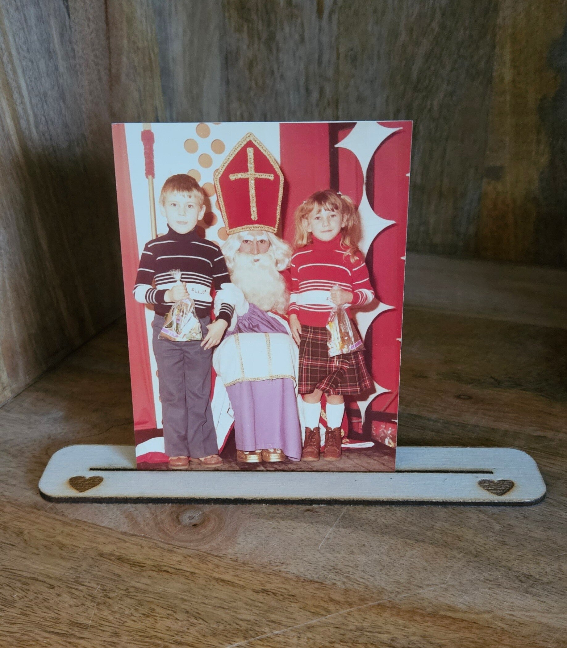 Met deze houten fotohouder met of zonder hartjes in berkenhout (voorbeeld1)of multiplex (voorbeeld2), stel jij je mooiste foto's ten toon. Hij kan gepersonaliseerd worden met naam of een klein tekstje (vorbeeld : "Gelukkig Nieuwjaar") en kan voor meerdere fotoformaten gebruikt worden.